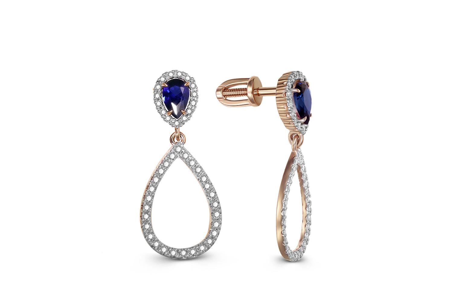Мастера компании NEWGOLD, приложив всё свое мастерство и искусство, создали для Вас на нашем собственном производстве Серьги-пусеты из красного золота с 2 корундами и 86 бриллиантами.