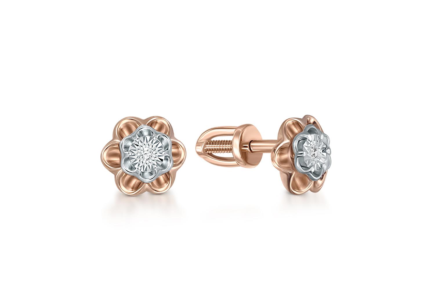 Мастера компании NEWGOLD, приложив всё свое мастерство и искусство, создали для Вас на нашем собственном производстве Серьги-пусеты Цветы из красного золота с 2 бриллиантами.