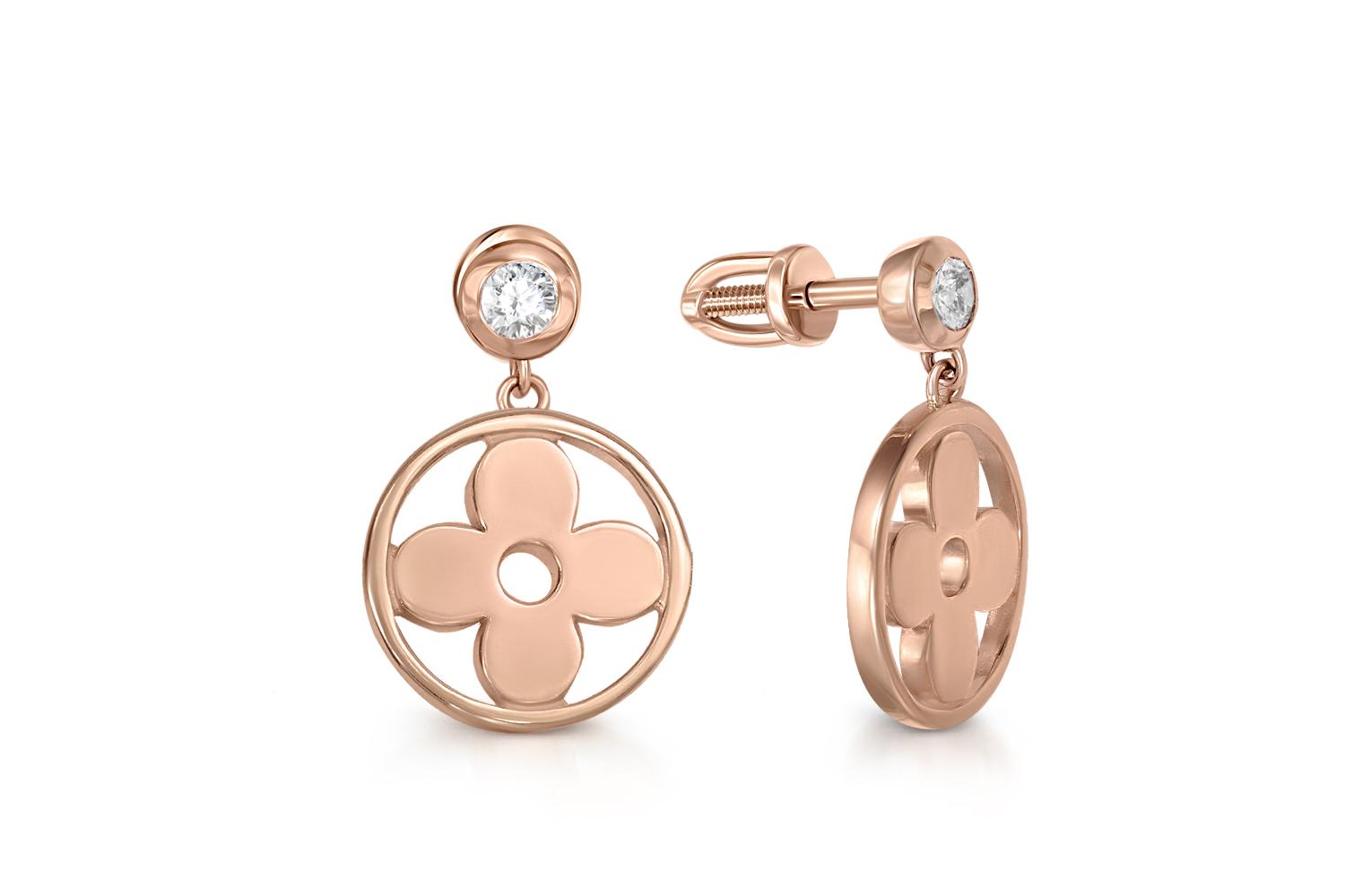 Мастера компании NEWGOLD, приложив всё свое мастерство и искусство, создали для Вас на нашем собственном производстве Серьги-пусеты Клевер из красного золота с 2 бриллиантами.