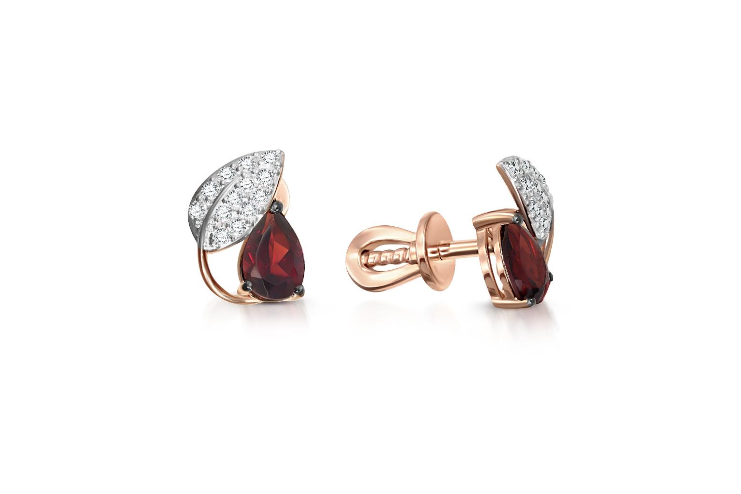 Мастера компании NEWGOLD, приложив всё свое мастерство и искусство, создали для Вас на нашем собственном производстве Серьги-пусеты Веточки из красного золота с 2 гранатами и 26 фианитами.