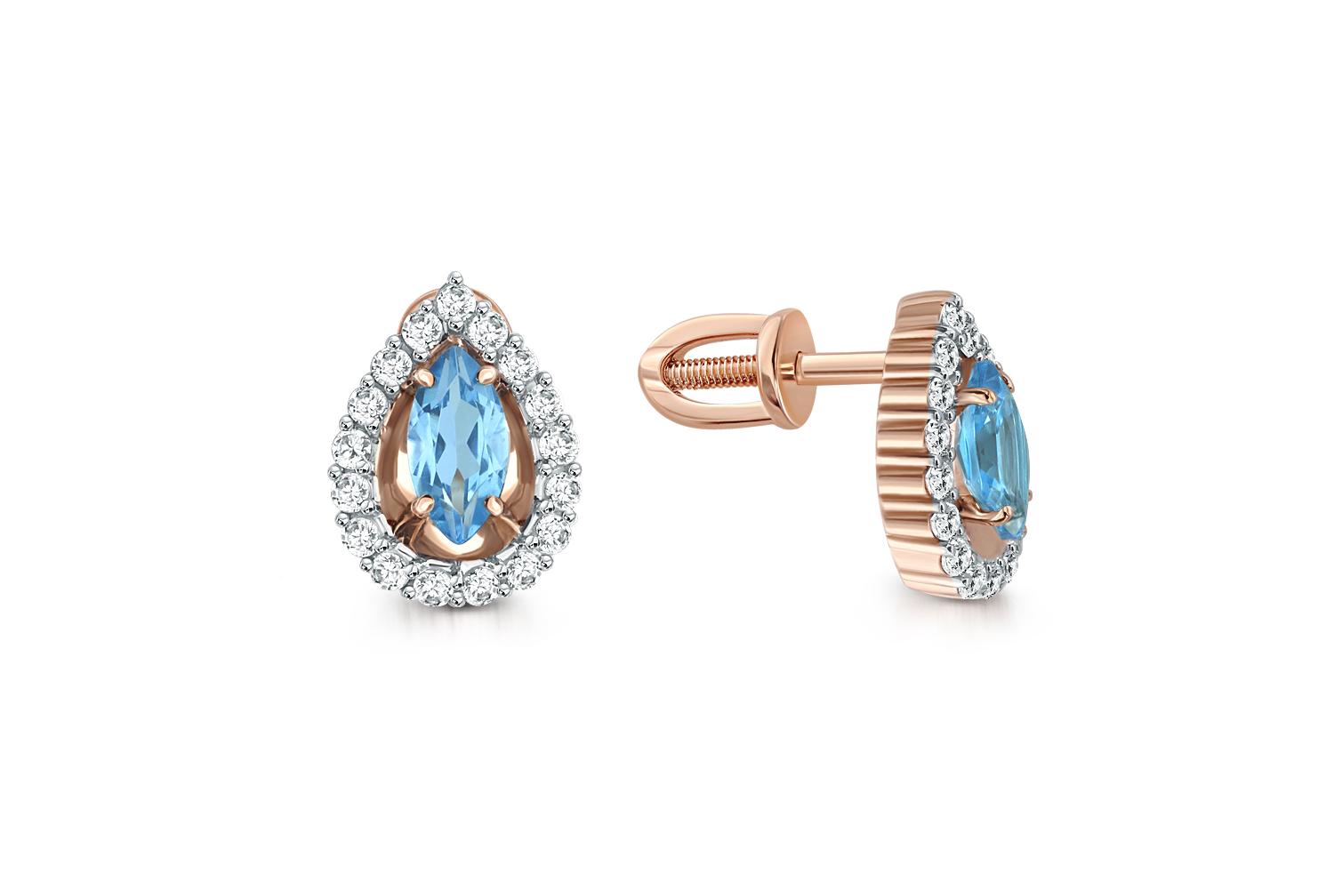 Мастера компании NEWGOLD, приложив всё свое мастерство и искусство, создали для Вас на нашем собственном производстве Серьги-пусеты из красного золота с 2 топазами swiss и 34 фианитами.