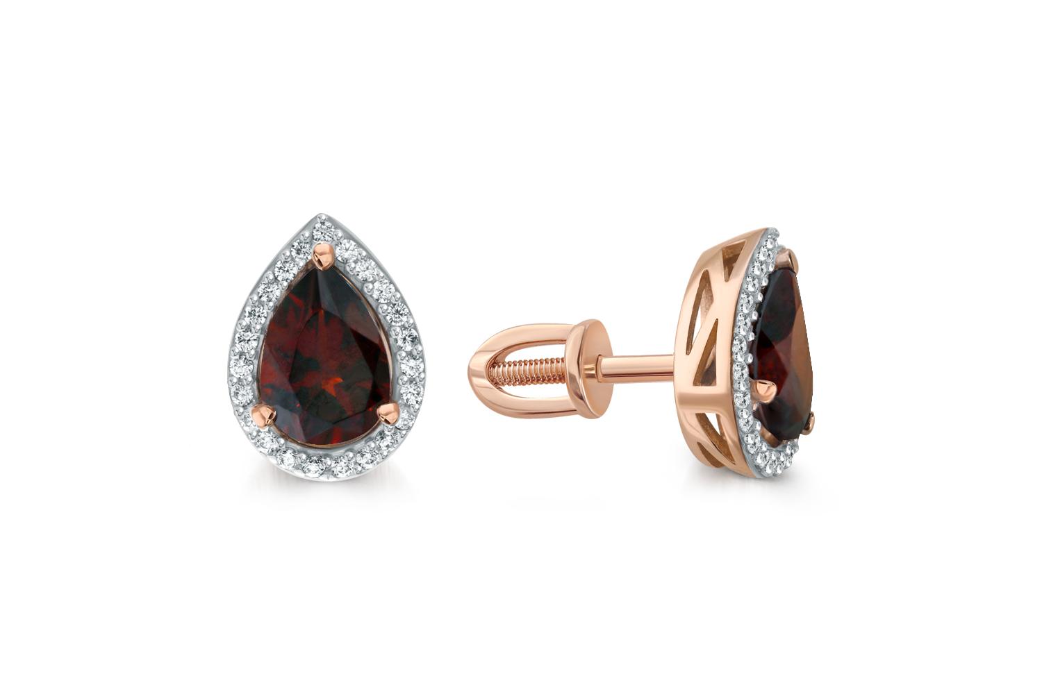 Закажите Серьги-пусеты из красного золота с 2 гранатами и 46 фианитами с получением в Москве через курьерскую службу доставки напрямую с нашего производственного склада завода NEWGOLD!