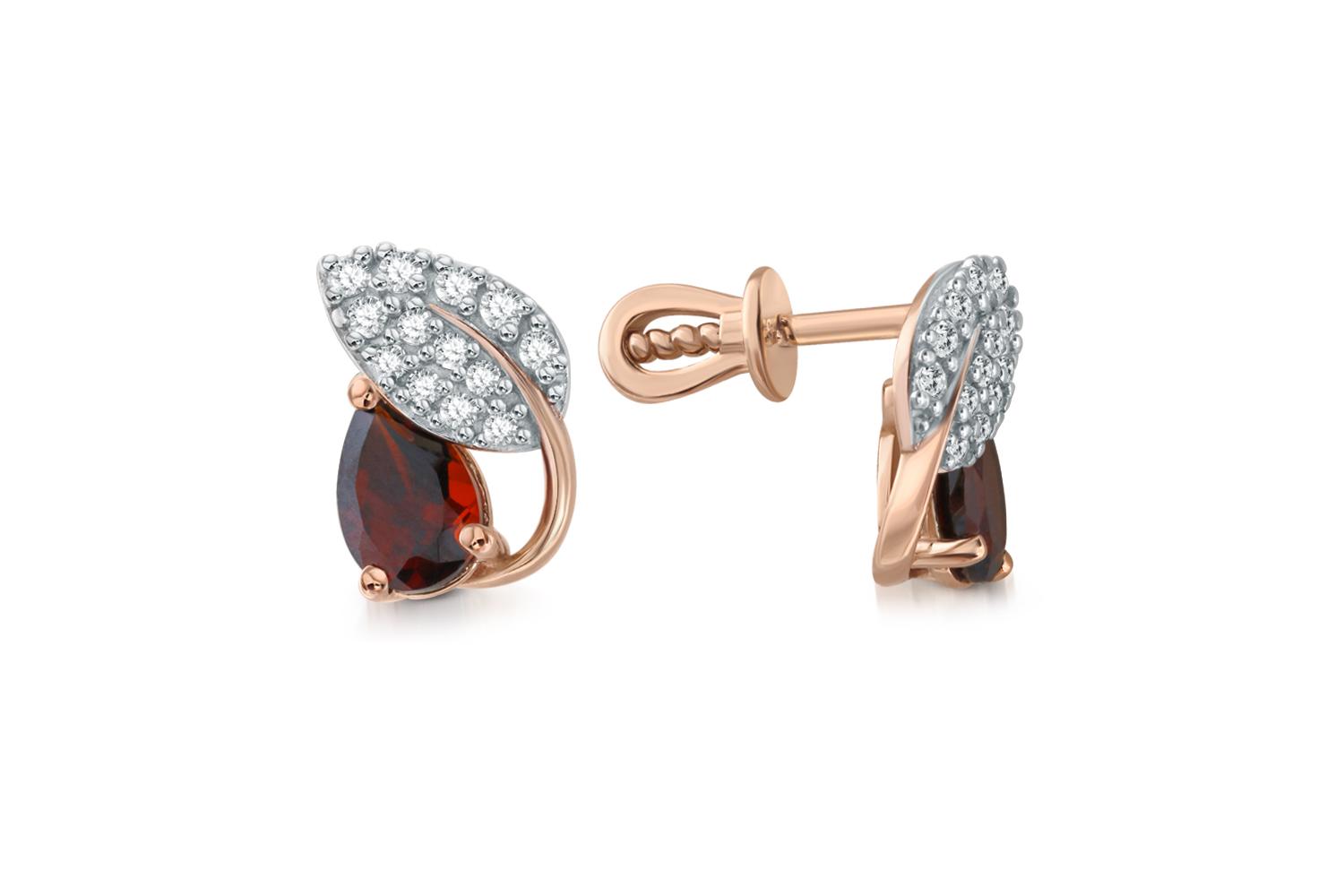Мастера компании NEWGOLD, приложив всё свое мастерство и искусство, создали для Вас на нашем собственном производстве Серьги-пусеты Веточки из красного золота с 2 гранатами и 26 фианитами.