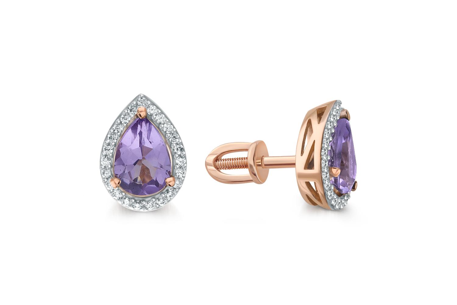 Мастера компании NEWGOLD, приложив всё свое мастерство и искусство, создали для Вас на нашем собственном производстве Серьги-пусеты из красного золота с 2 аметистами и 46 фианитами.