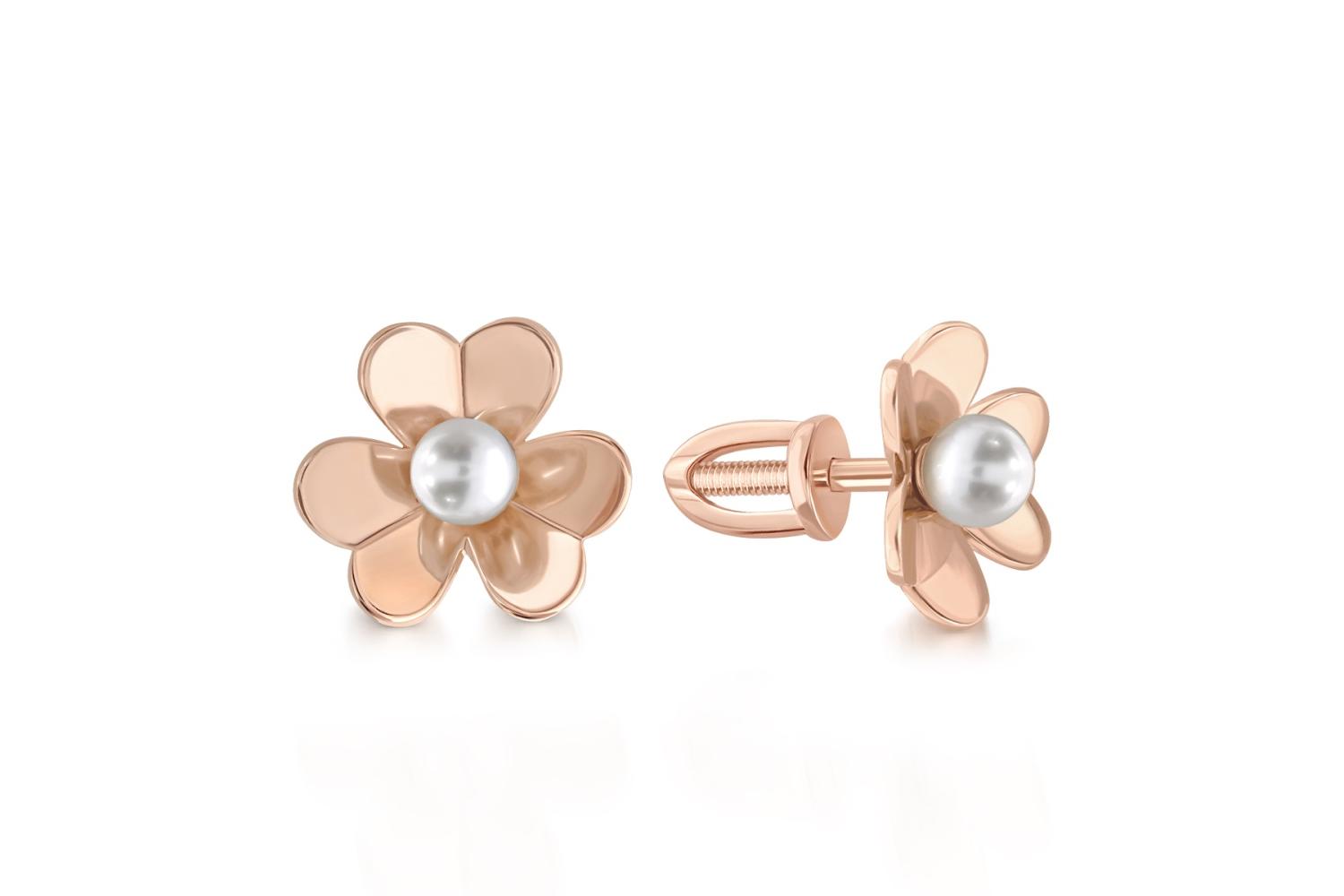 Закажите Серьги-пусеты Цветы из красного золота с 2 жемчужинами с получением в Москве через курьерскую службу доставки напрямую с нашего производственного склада завода NEWGOLD!