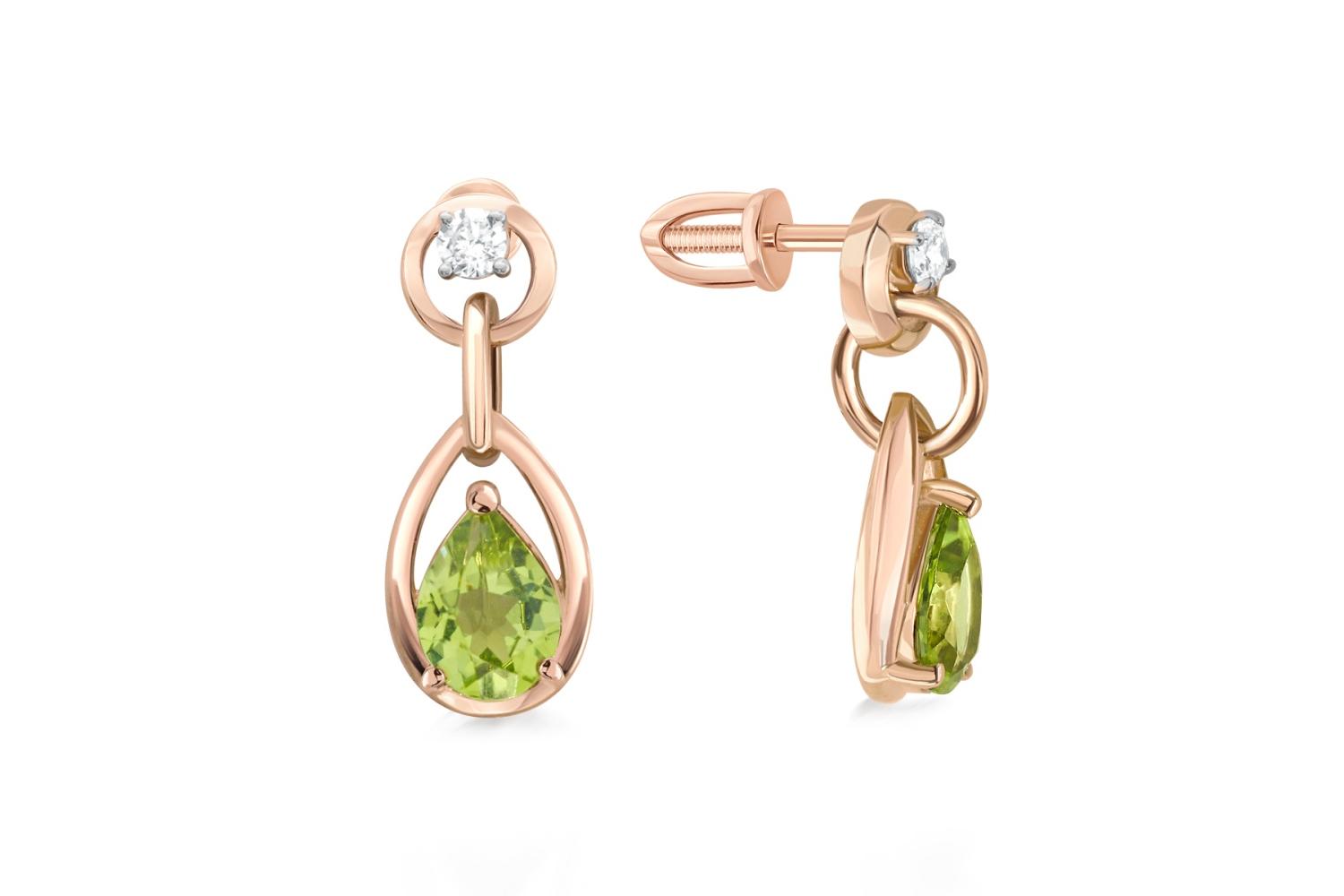 Мастера компании NEWGOLD, приложив всё свое мастерство и искусство, создали для Вас на нашем собственном производстве Серьги-пусеты из красного золота с 2 хризолитами и 2 фианитами.