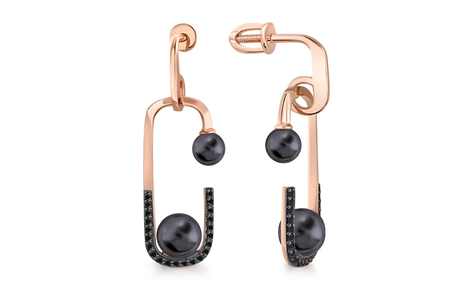 Жемчуг черный культивированный, количество 2 шт., огранка круг, размер 6ˣ6,5 ; Жемчуг черный культивированный, количество 2 шт., огранка круг, размер 4ˣ4,5 ; Фианит чёрный, количество 44 шт., огранка круг, размер 1 мм