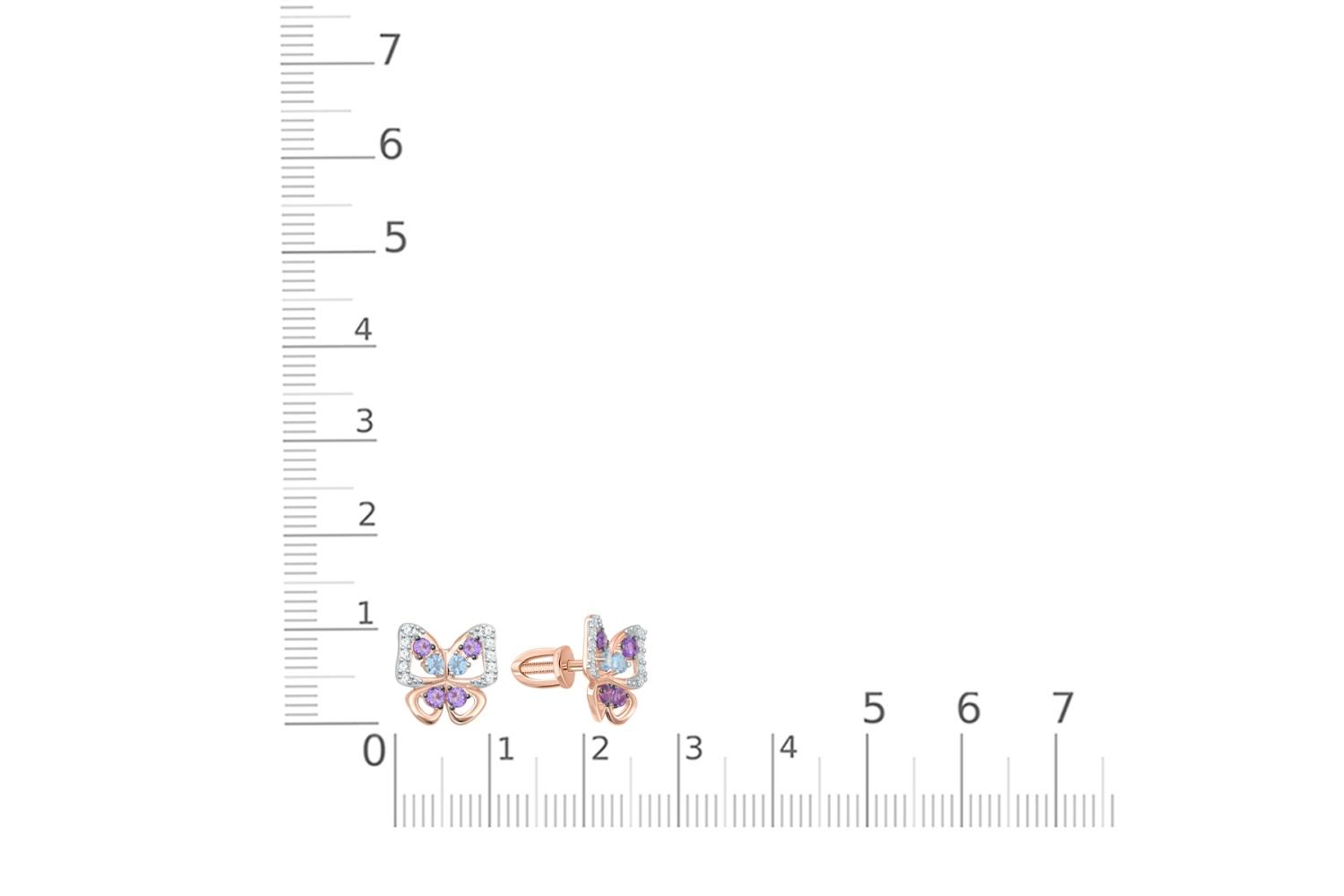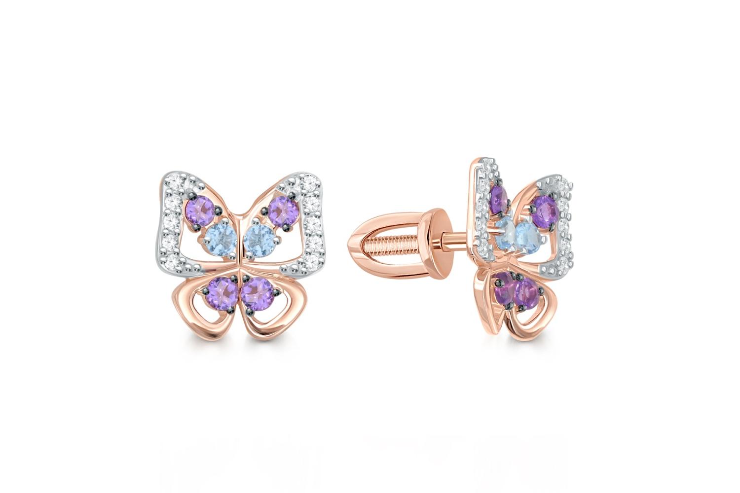 Мастера компании NEWGOLD, приложив всё свое мастерство и искусство, создали для Вас на нашем собственном производстве Серьги-пусеты Бабочки из красного золота с аметистами, топазами swiss и фианитами.