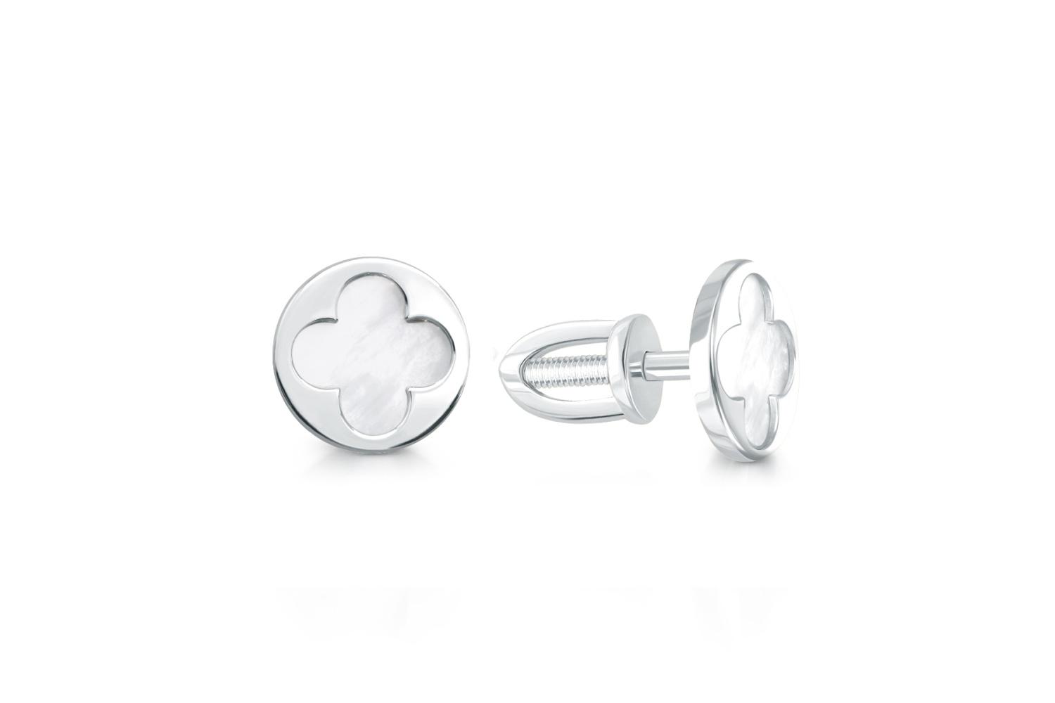 Мастера компании NEWGOLD, приложив всё свое мастерство и искусство, создали для Вас на нашем собственном производстве Серьги-пусеты Клевер из белого золота с перламутром.