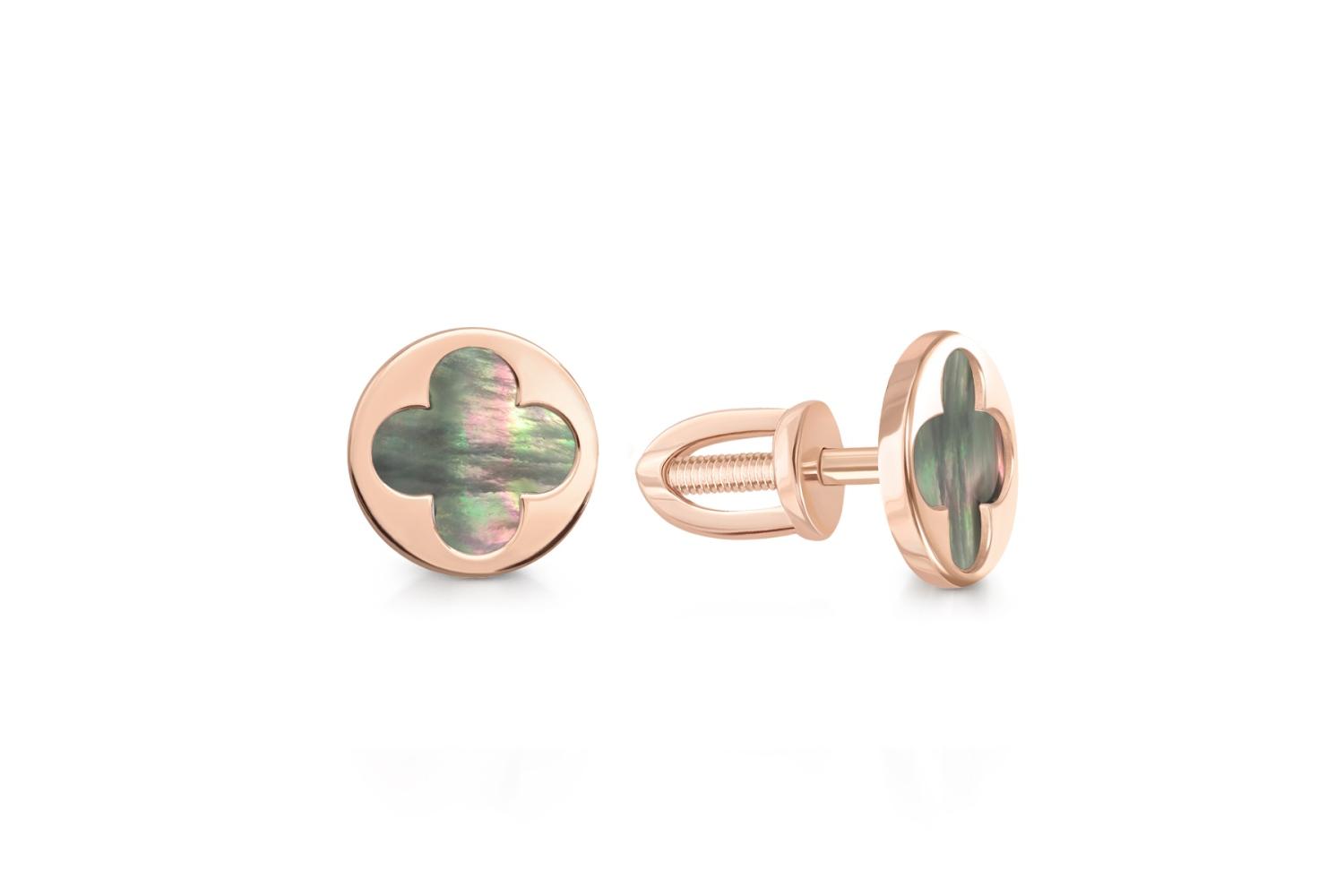 Мастера компании NEWGOLD, приложив всё свое мастерство и искусство, создали для Вас на нашем собственном производстве Серьги-пусеты Клевер из красного золота с перламутром.