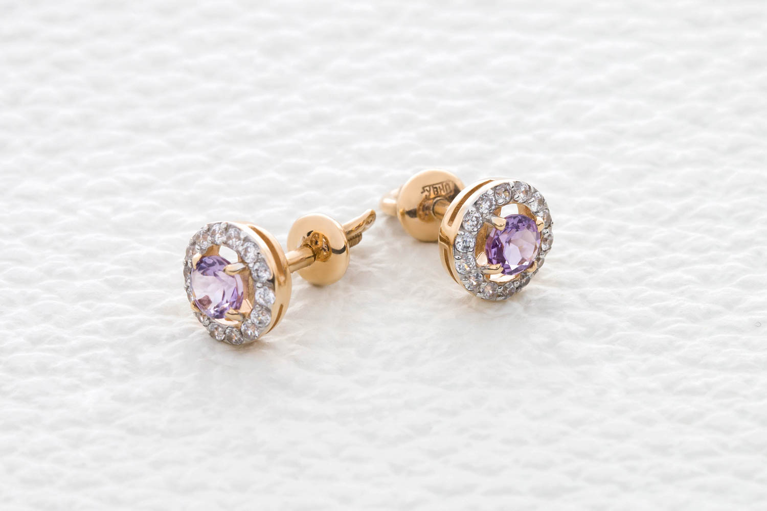 Мастера компании NEWGOLD, приложив всё свое мастерство и искусство, создали для Вас на нашем собственном производстве Серьги-пусеты из красного золота с 2 аметистами и 28 фианитами.