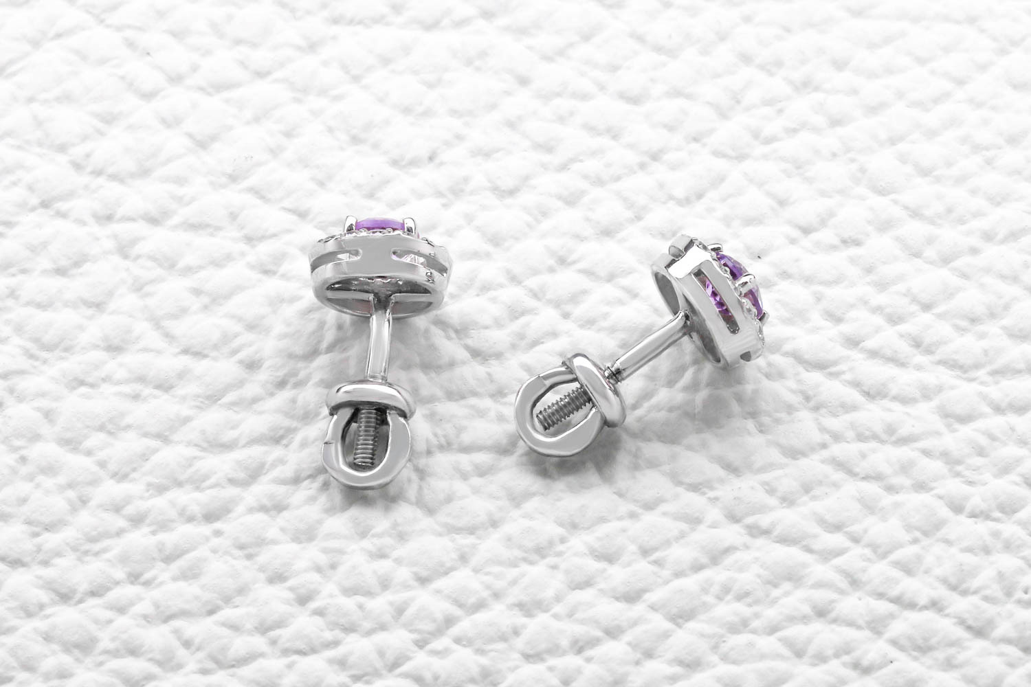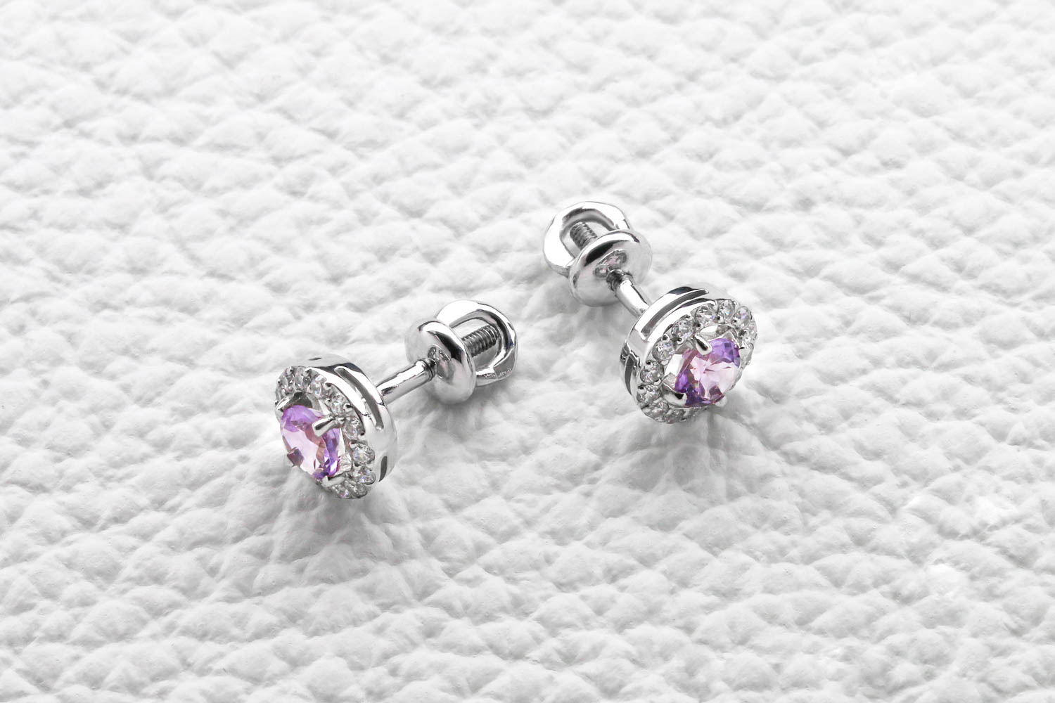 Мастера компании NEWGOLD, приложив всё свое мастерство и искусство, создали для Вас на нашем собственном производстве Серьги-пусеты из белого золота с 2 аметистами и 28 фианитами.