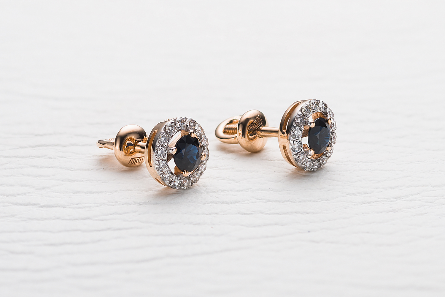 Мастера компании NEWGOLD, приложив всё свое мастерство и искусство, создали для Вас на нашем собственном производстве Серьги-пусеты из красного золота с 2 сапфирами и 28 бриллиантами.