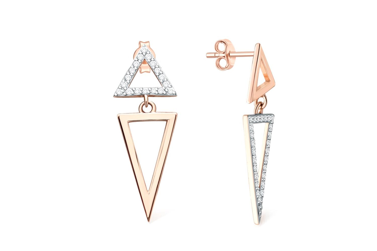 Мастера компании NEWGOLD, приложив всё свое мастерство и искусство, создали для Вас на нашем собственном производстве Серьги-пусеты Треугольники из красного золота с 44 фианитами.