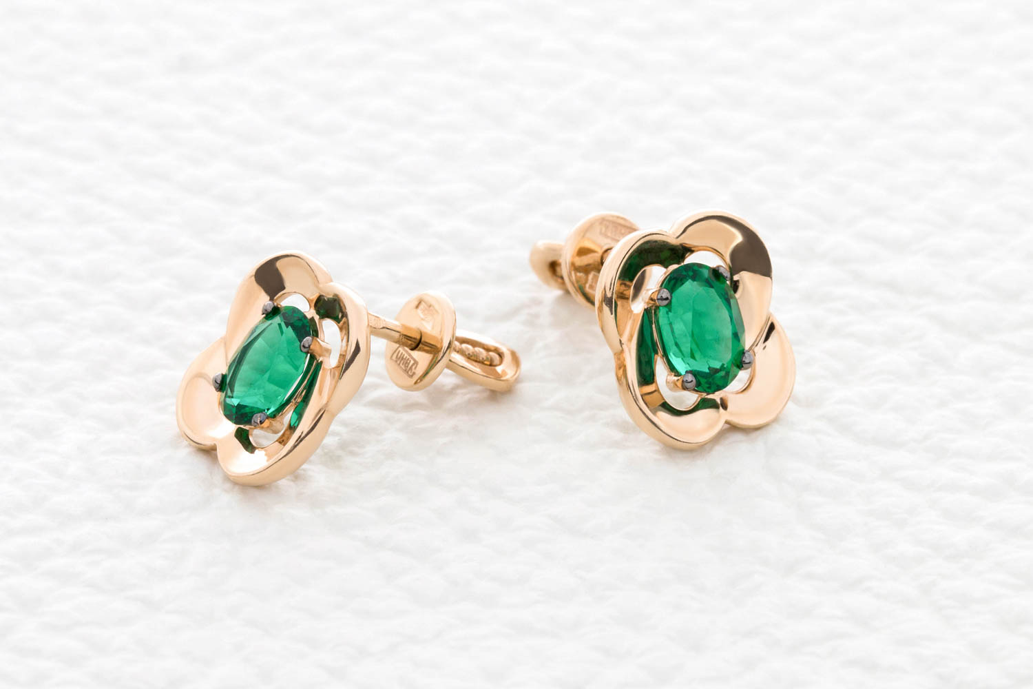 Мастера компании NEWGOLD, приложив всё свое мастерство и искусство, создали для Вас на нашем собственном производстве Серьги-пусеты из красного золота с 2 изумрудами.
