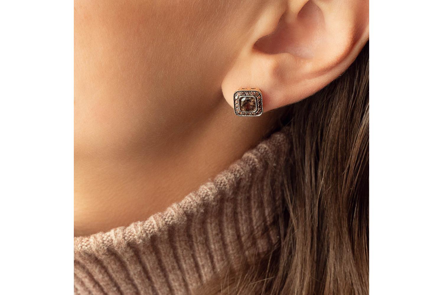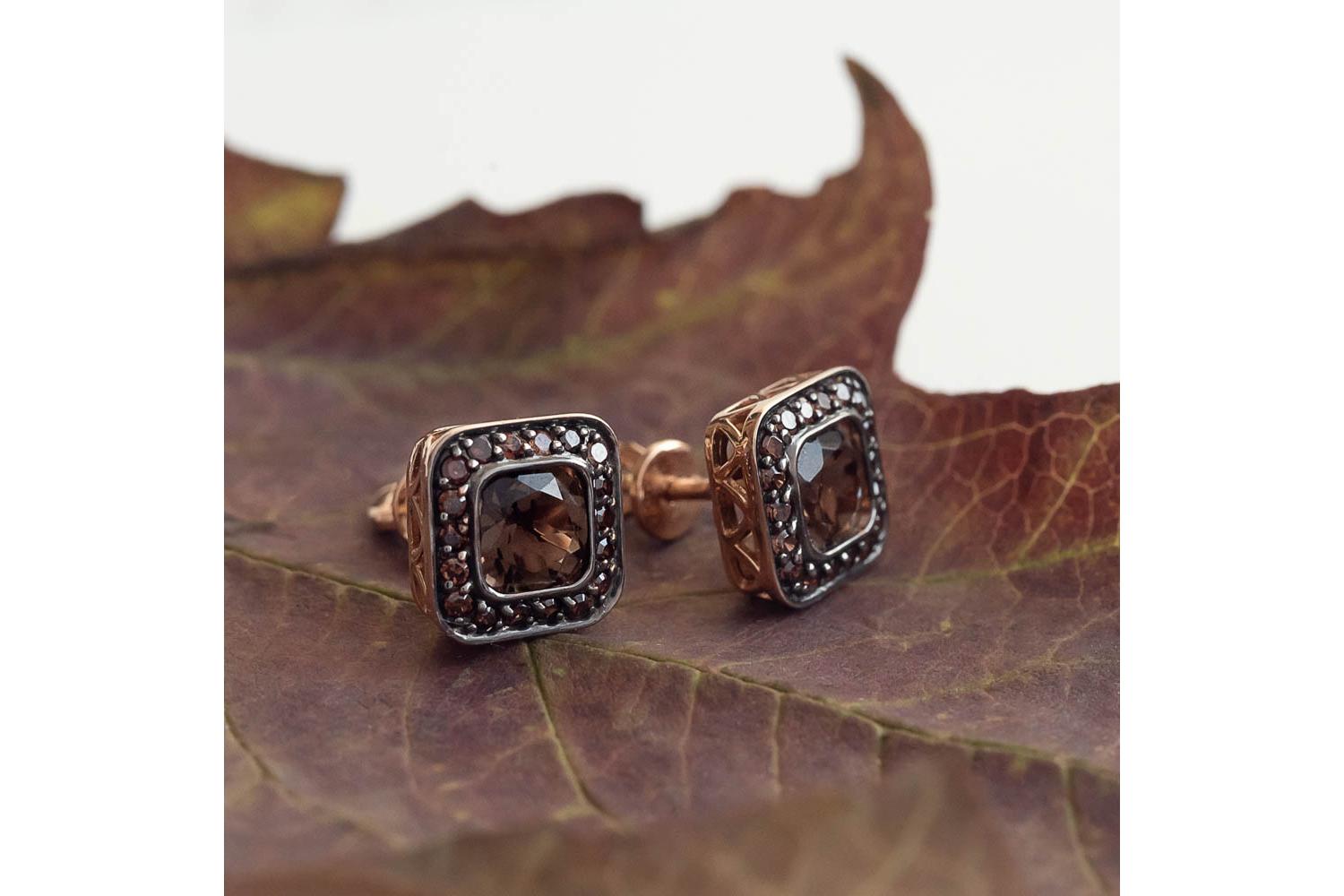Мастера компании NEWGOLD, приложив всё свое мастерство и искусство, создали для Вас на нашем собственном производстве Серьги-пусеты Квадраты из красного золота с 2 раухтопазами и 36 фианитами.