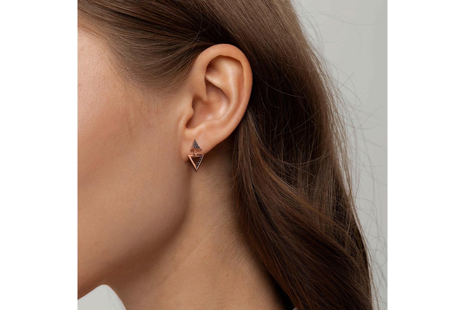 Мастера компании NEWGOLD, приложив всё свое мастерство и искусство, создали для Вас на нашем собственном производстве Серьги-пусеты Треугольники из красного золота с 30 фианитами.