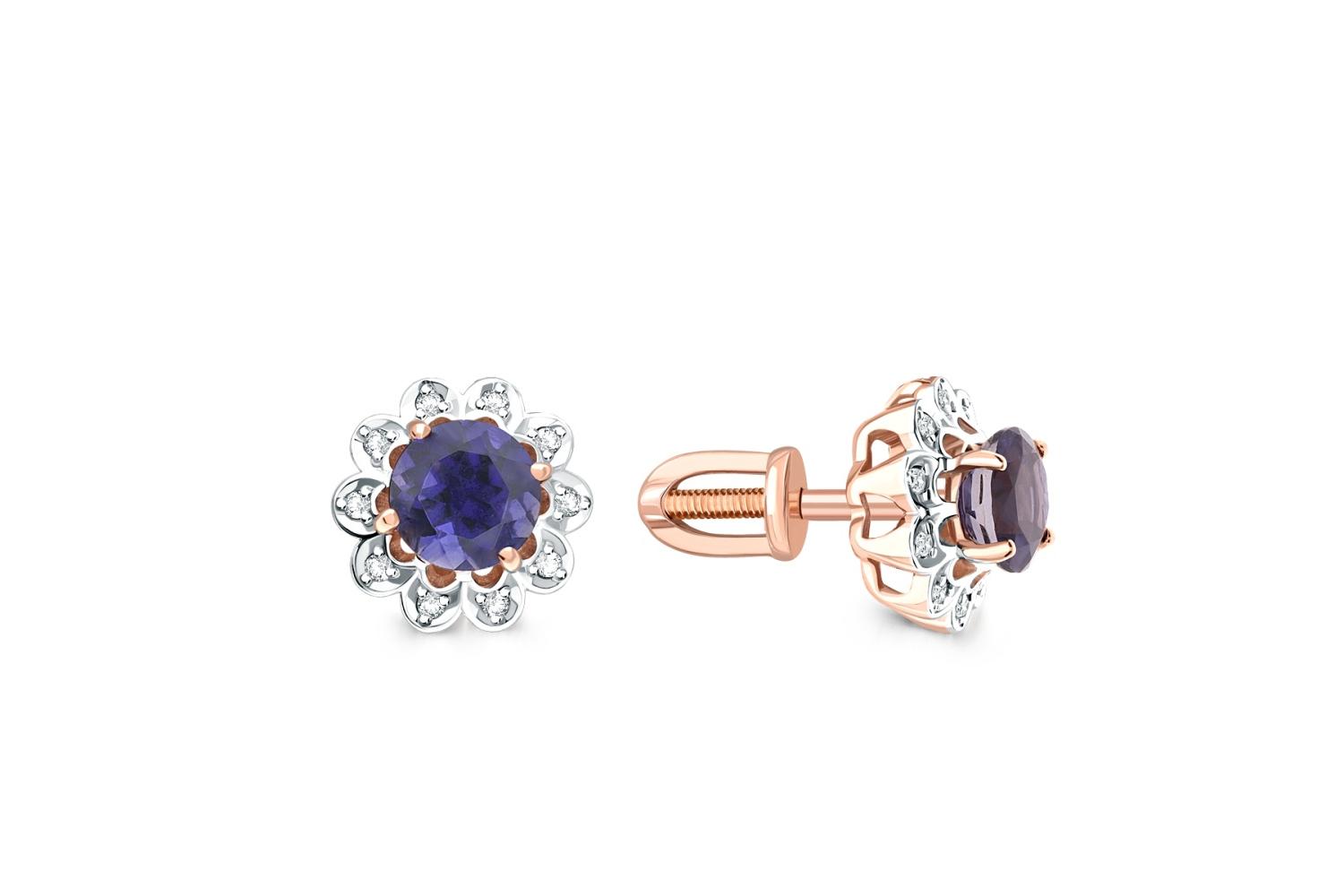 Мастера компании NEWGOLD, приложив всё свое мастерство и искусство, создали для Вас на нашем собственном производстве Серьги-пусеты Цветы из красного золота с 2 иолитами и 20 фианитами.