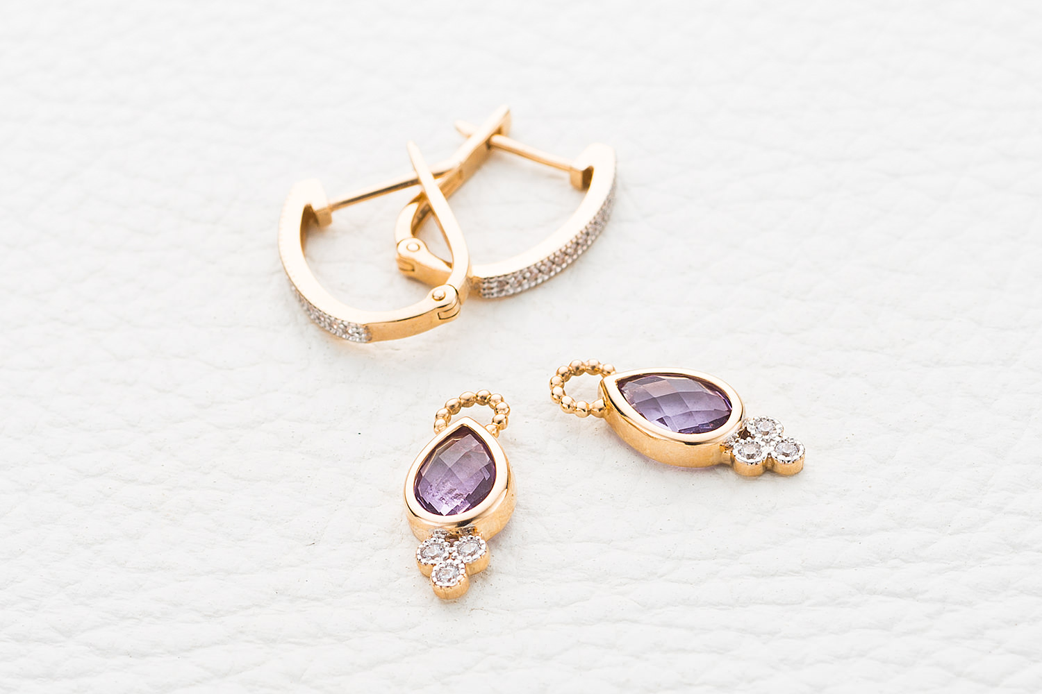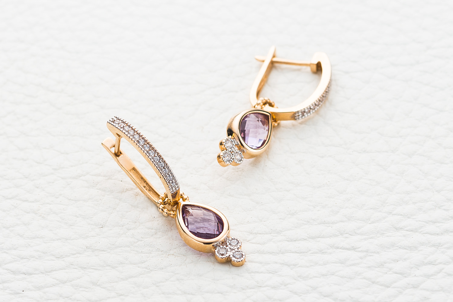 Аметист натуральный, количество 2 шт., огранка груша-бриолет, размер 9ˣ6 ; Фианит б/цв, количество 6 шт., огранка круг, размер 1,5 мм ; Фианит б/цв, количество 26 шт., огранка круг, размер 1 мм