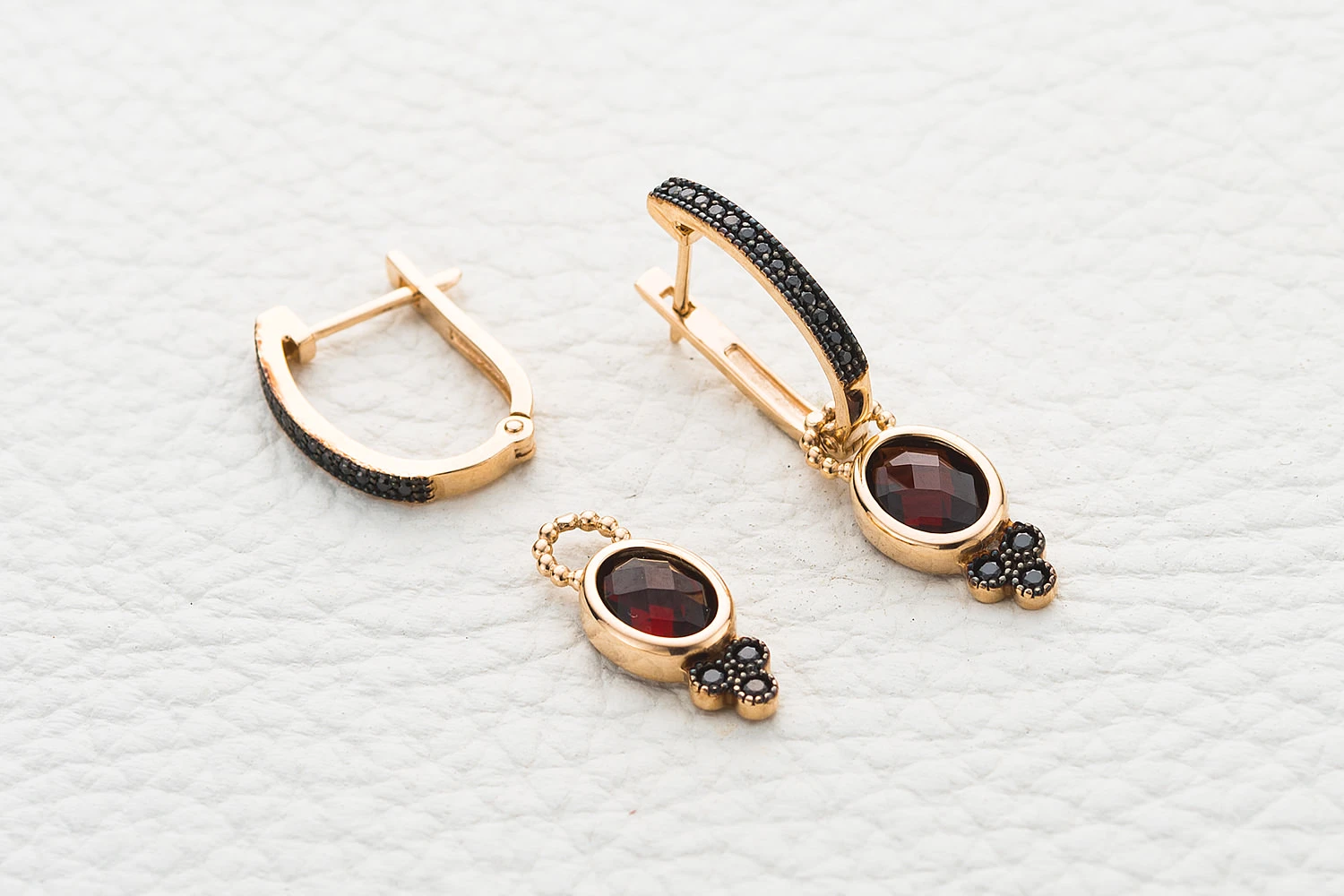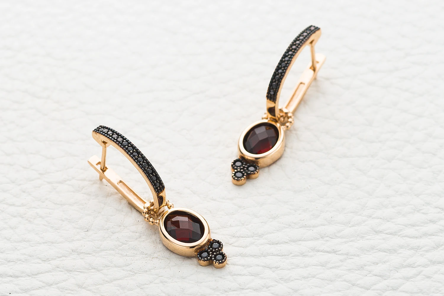 Гранат натуральный, количество 2 шт., огранка овал-бриолет, размер 8ˣ6 ; Фианит чёрный, количество 6 шт., огранка круг, размер 1,5 мм ; Фианит чёрный, количество 26 шт., огранка круг, размер 1 мм