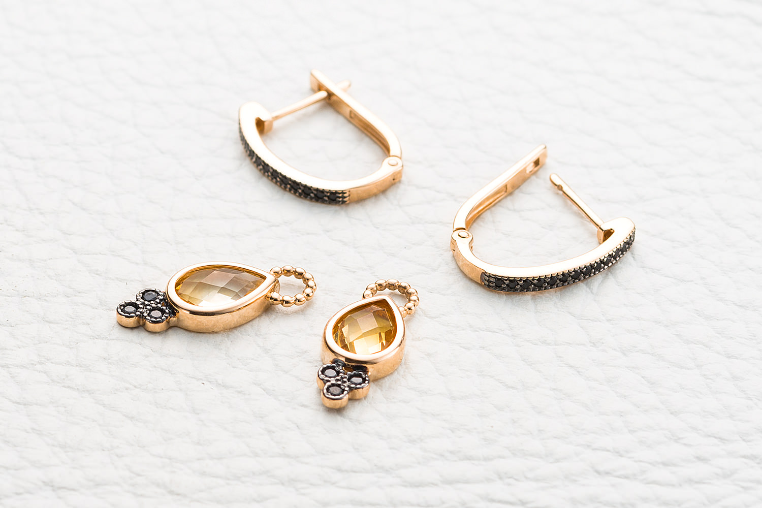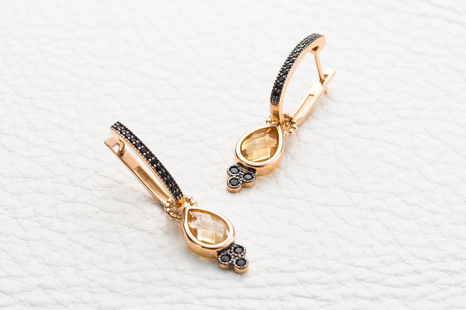 Цитрин натуральный, количество 2 шт., огранка груша-бриолет, размер 9ˣ6 ; Фианит чёрный, количество 6 шт., огранка круг, размер 1,5 мм ; Фианит чёрный, количество 26 шт., огранка круг, размер 1 мм
